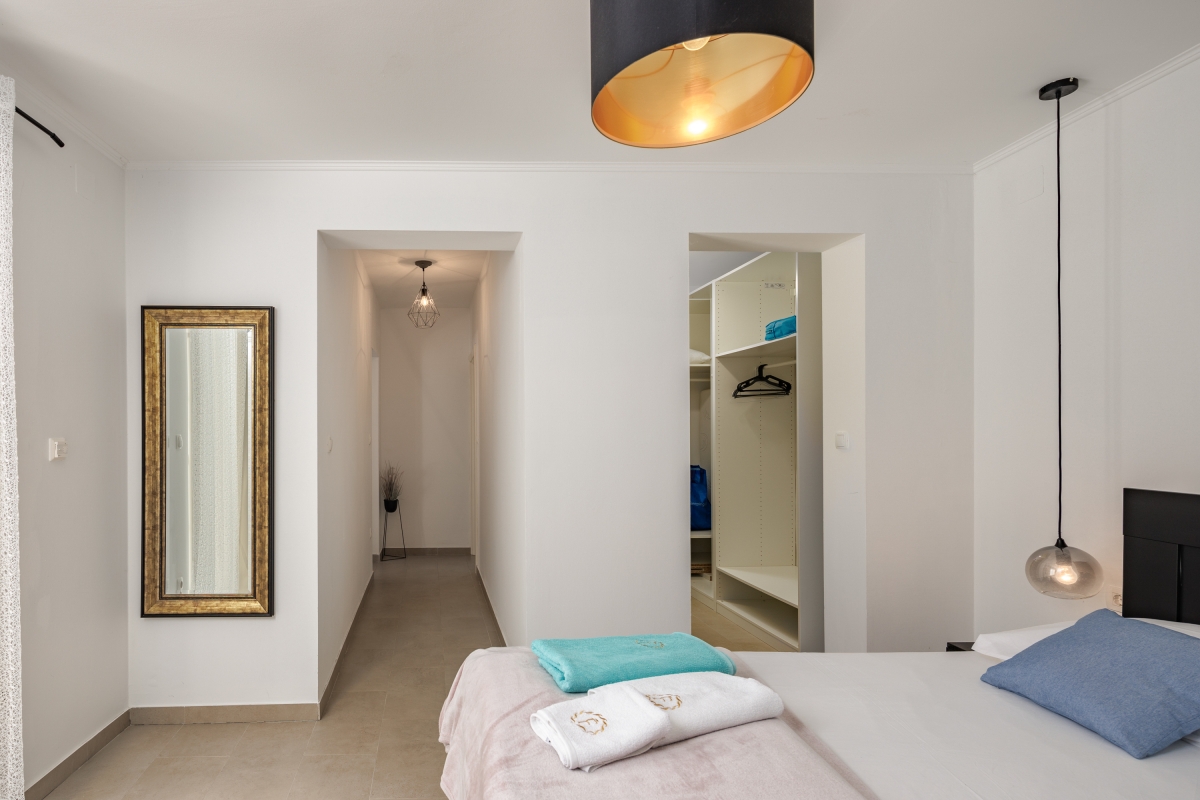 Bedroom 1: The ensuite master bedroom is furnished with a double bed, a wardrobe and French doors which open onto the terrace