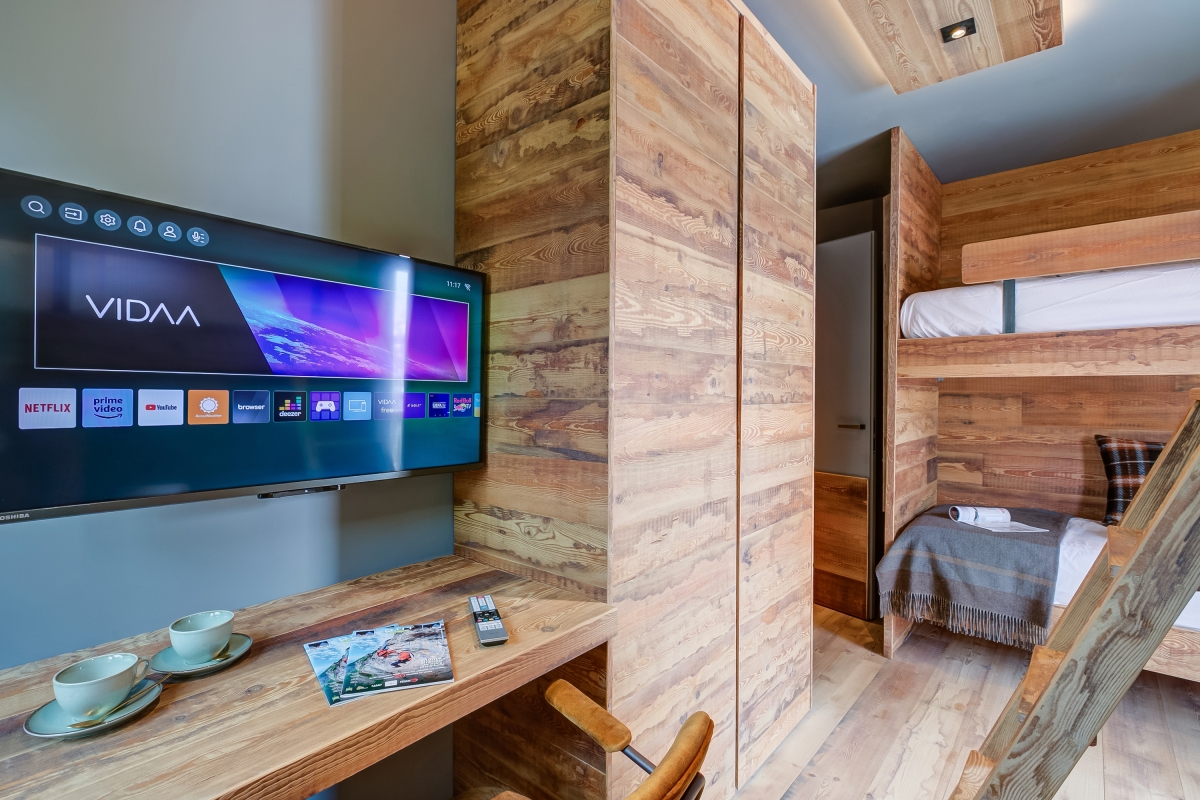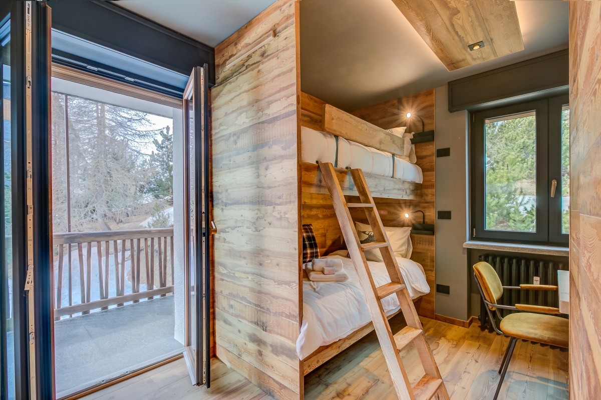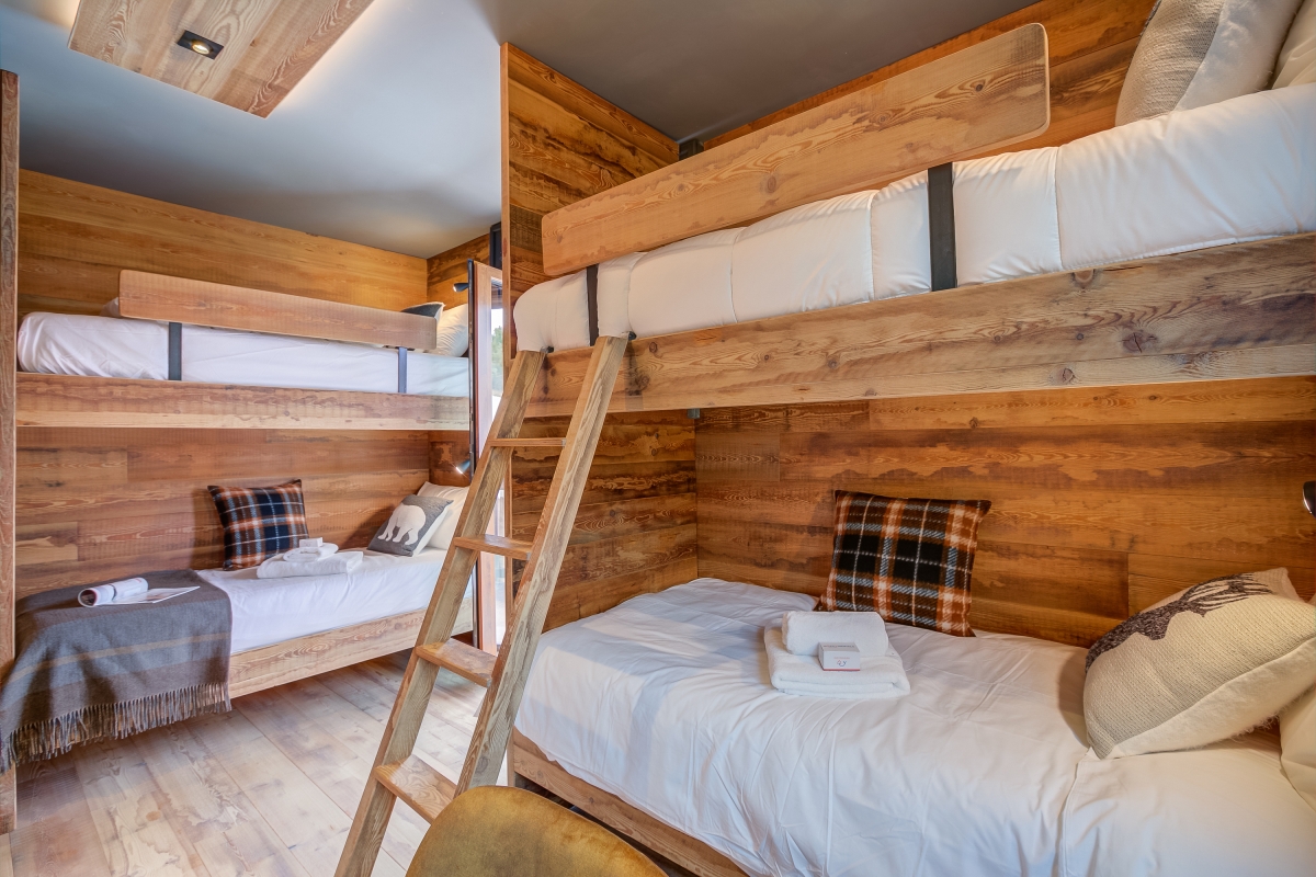 Bedroom 2: This charming wood-panelled room consists of 2 separate bunk beds, with a desk, a flat-screen TV, a wardrobe and French windows out onto the balcony.