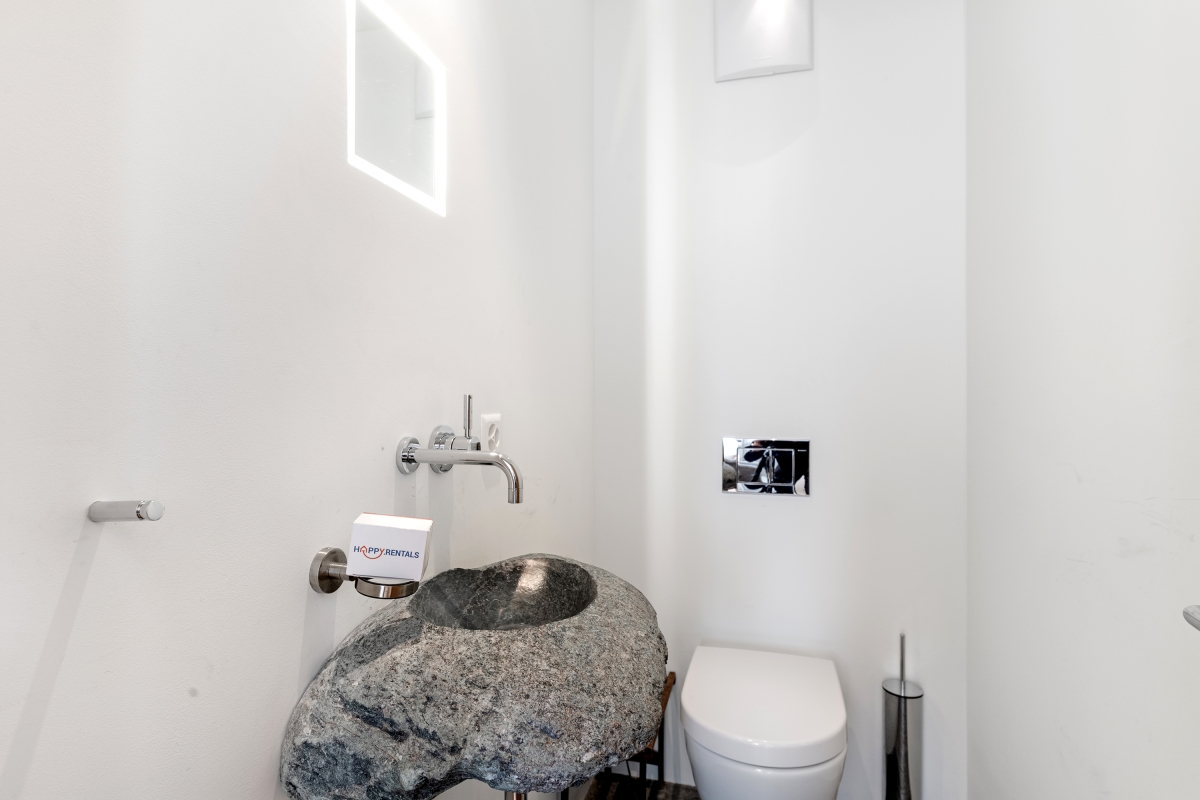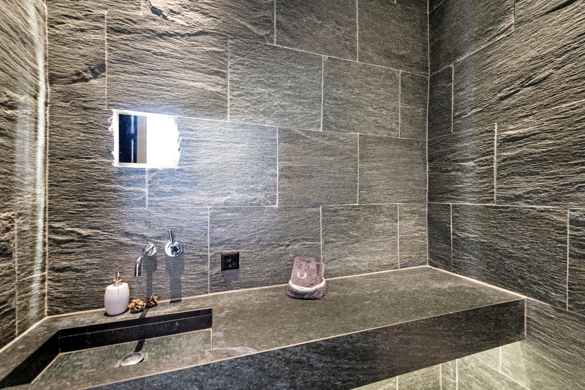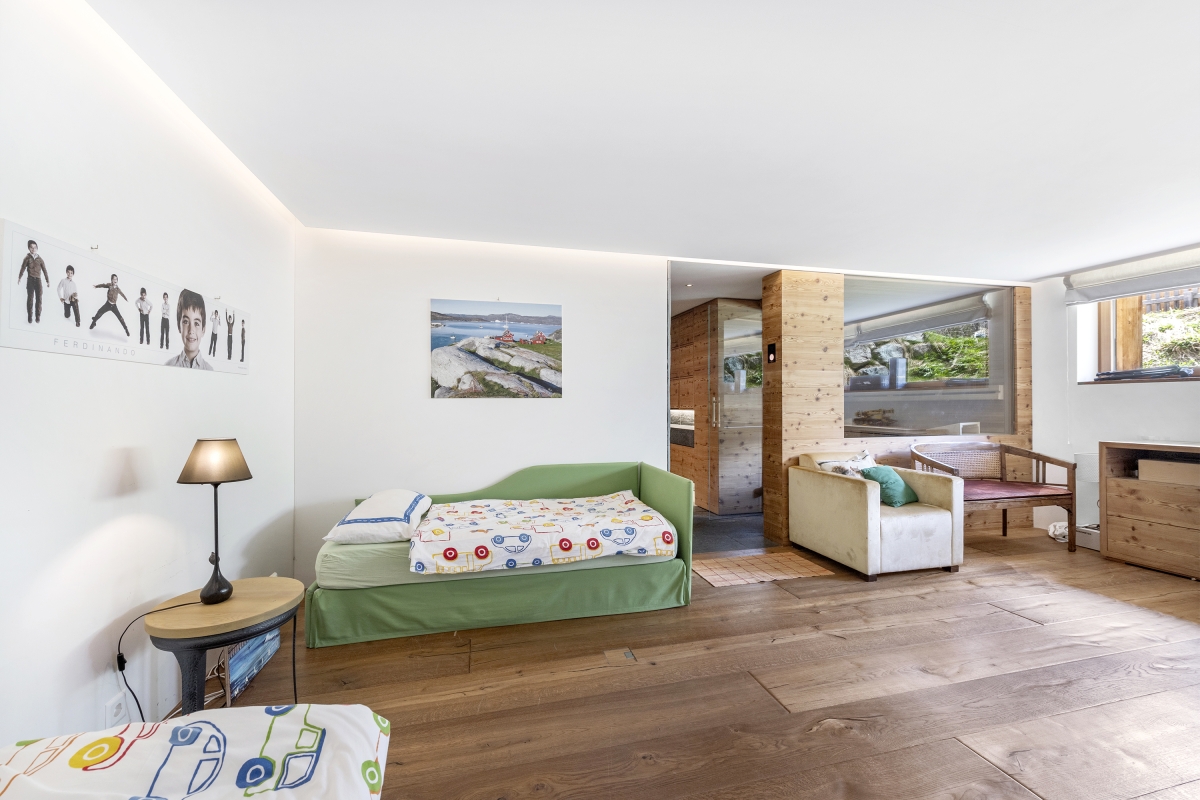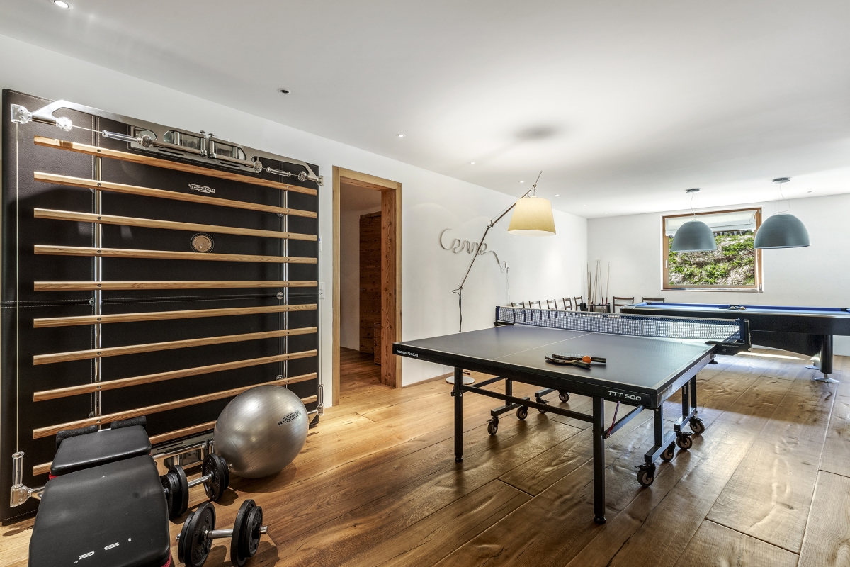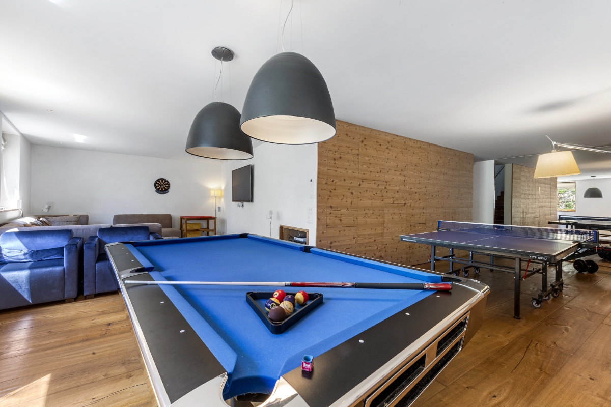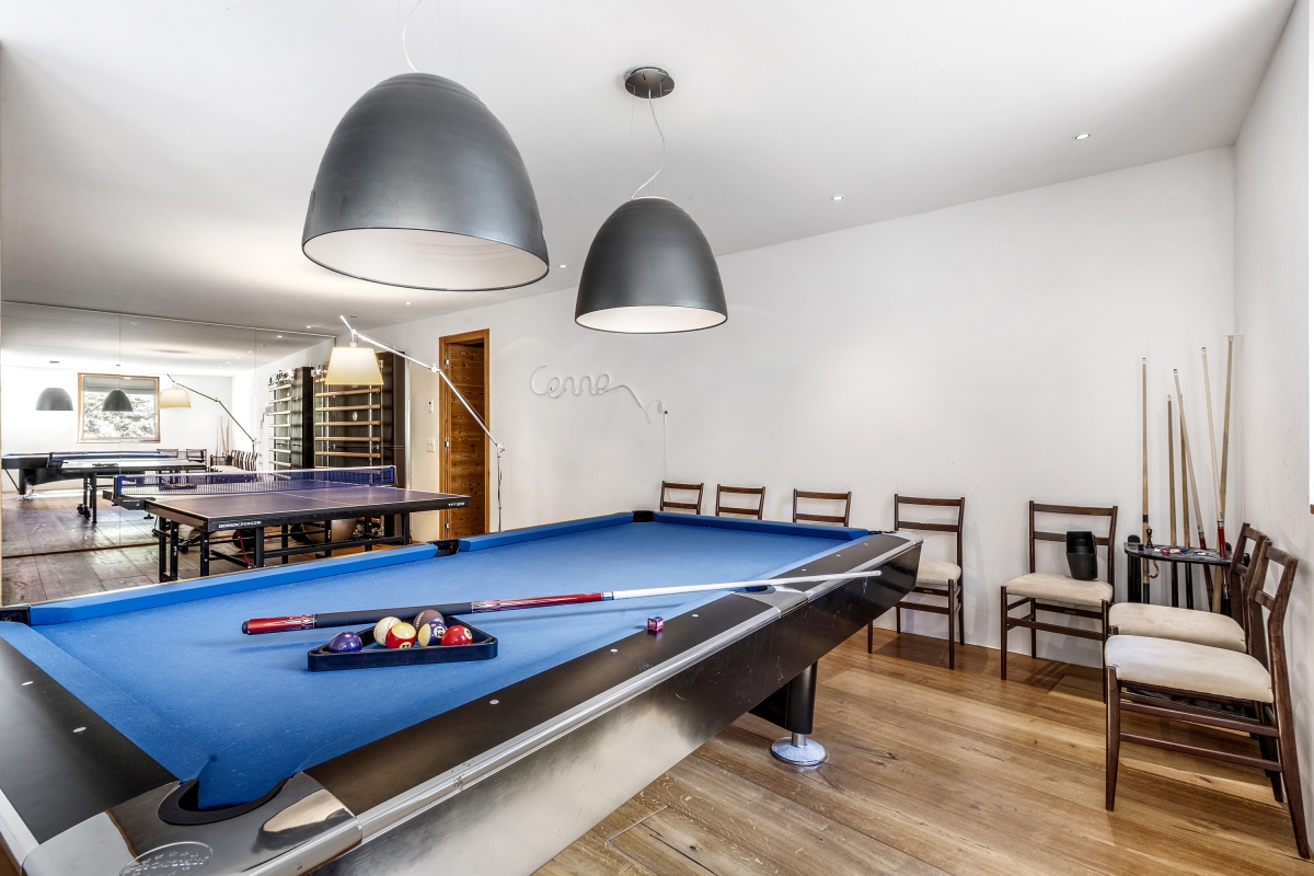 The house is full of light and finished to the very highest standards, with natural elements; stone, wood and open metal stairs. On the ground floor, there is a spacious games room, with ping pong tables, a pool table, gym equipment, comfortable sofas, armchairs and a flat-screen TV.