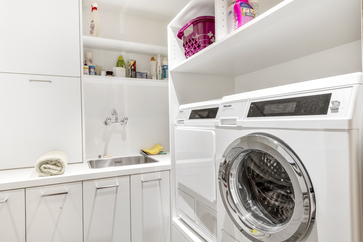 The kitchen is adjacent to the dining area and, like the sitting area, has a large window with stunning views. The modern kitchen units are natural wood. There is a central island with a breakfast bar and the kitchen is well-equipped with an induction hob, oven, microwave, dishwasher, fridge, freezer and coffee machine.