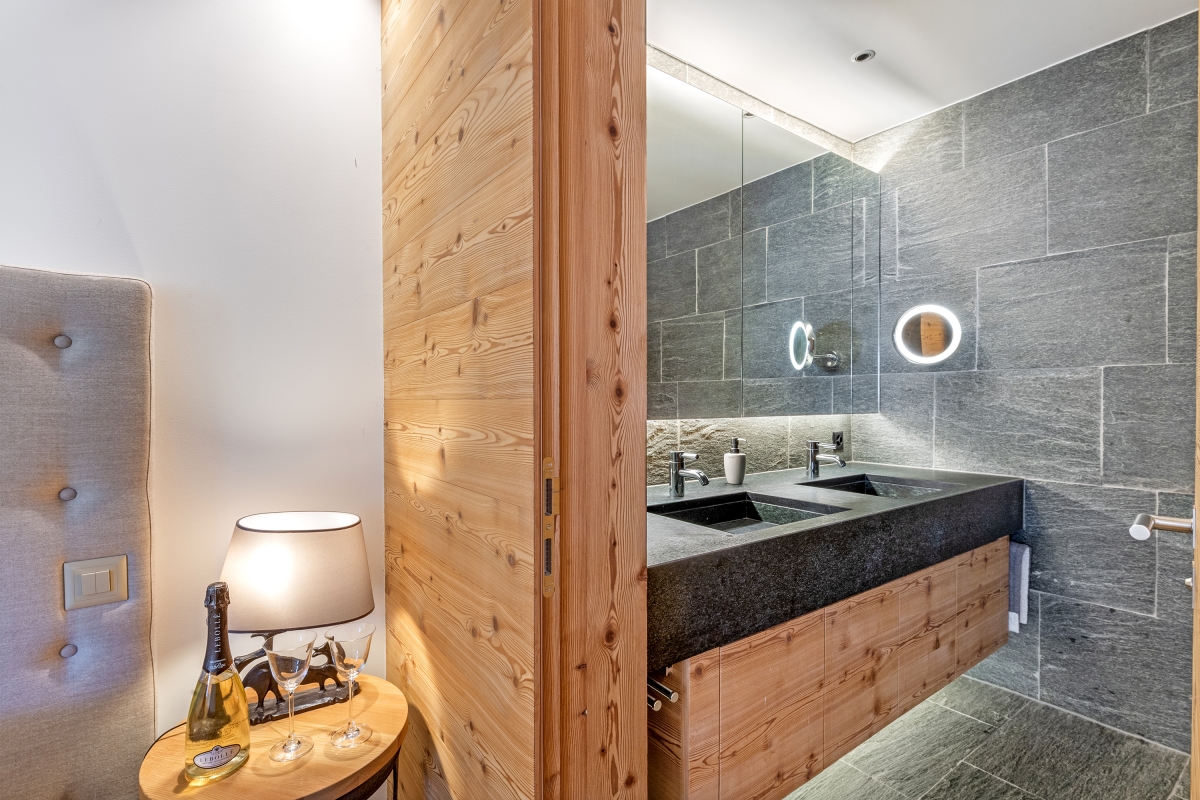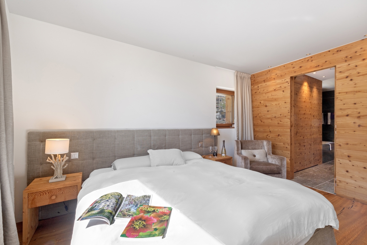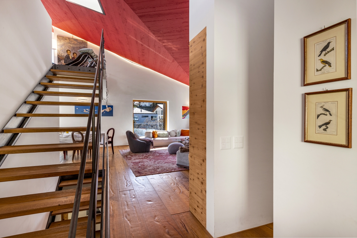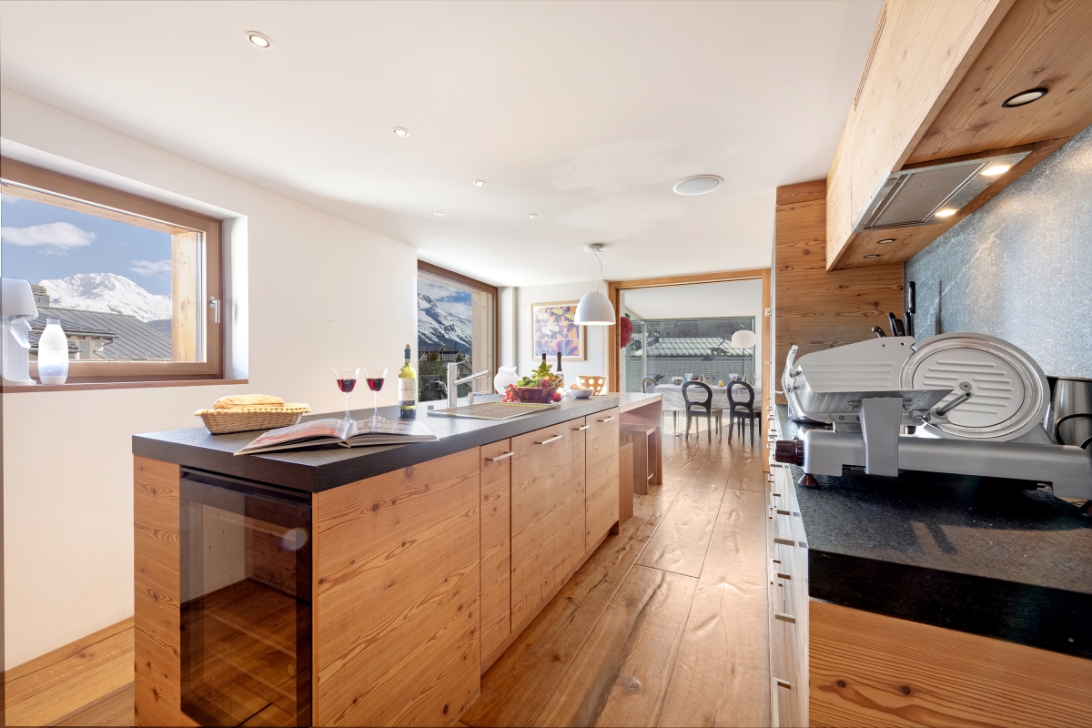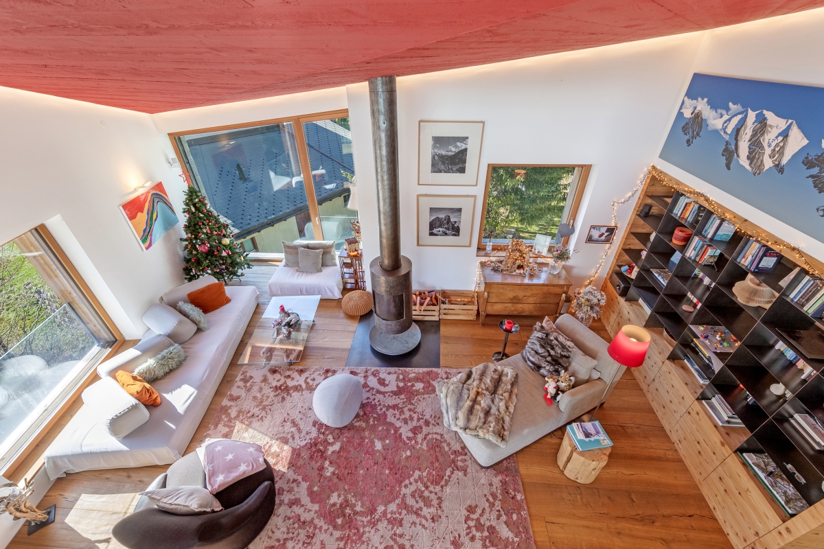 The main living space is on the first floor, with a stylish double-height sitting room, full of sunlight thanks to huge windows with panoramic mountain views. The room is furnished with a stylish sofa and chairs, plus a wood-burning stove. The mezzanine chill-out area is tucked under the eaves. Here guests can relax and enjoy the mountains thanks to a huge corner window. Back downstairs, the dining area leads off the main sitting room with a large table and chairs. Sliding glass doors open out onto a wide, corner balcony furnished with a coffee table and chairs, looking out over the mountains.