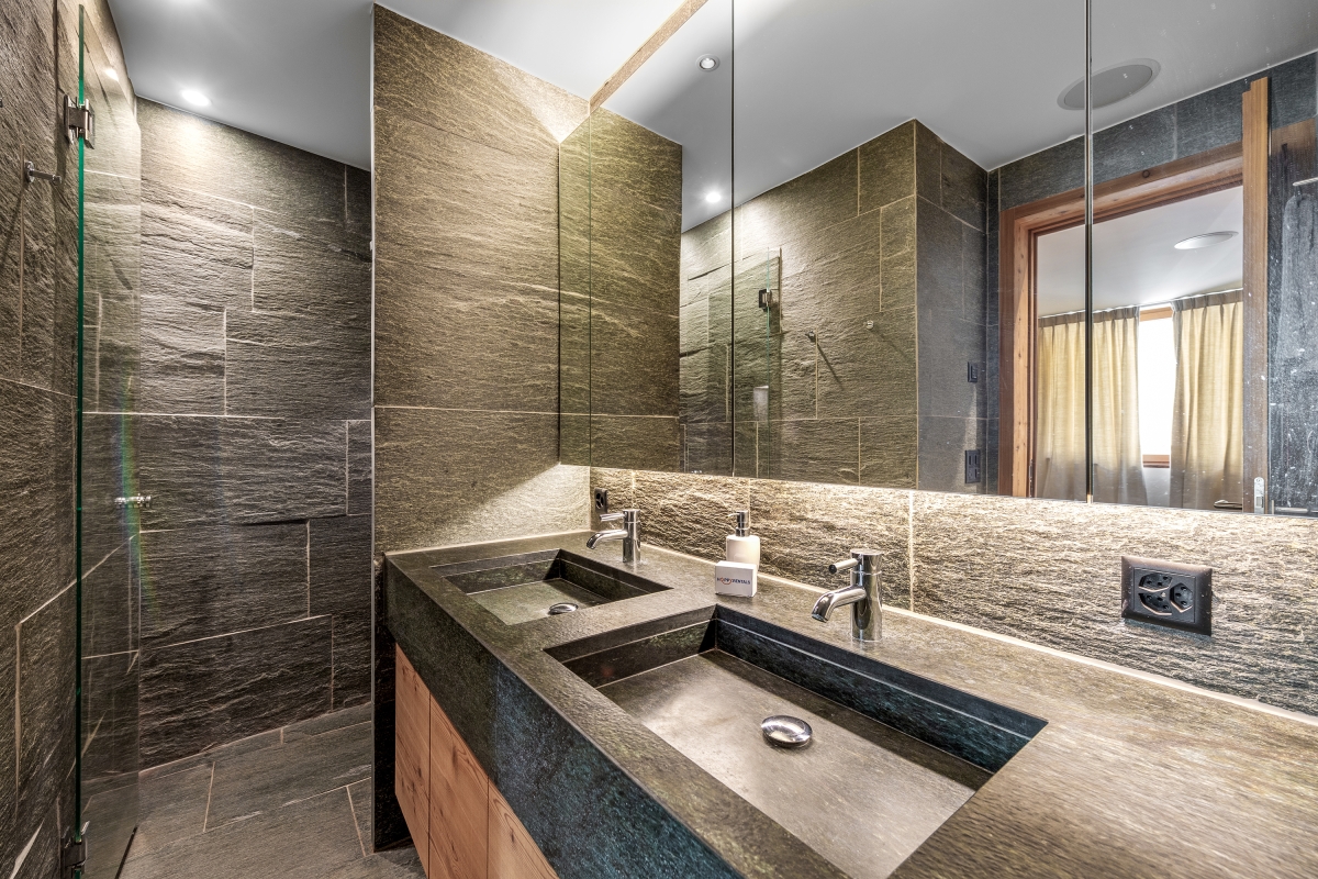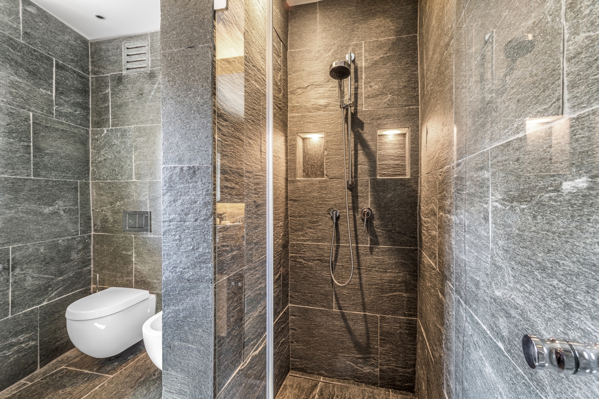 The stylish stone-tiled ensuite bathrooms all have a large glass shower, basin and WC.
