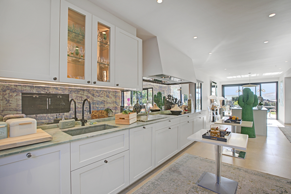The owners have created a stylish, elegant property both inside and out. Full of light, with easy access to the outside living spaces and beautiful garden, the villa encourages indoor/outdoor living. The open plan living area is stylishly furnished and has large glass doors that open directly on to the terrace. The main kitchen is well appointed with an induction hob, oven, microwave, dishwasher, Nespresso coffee machine and fridge/freezer. French windows at either end of the kitchen lead directly out to the outside dining areas, where guests can enjoy meals al fresco. To the back of the villa there is a charming, shaded terrace with a smaller dining table, whilst at the front, overlooking the swimming pool, there is another, larger dining area.