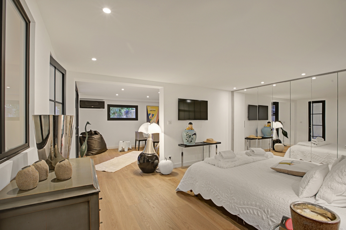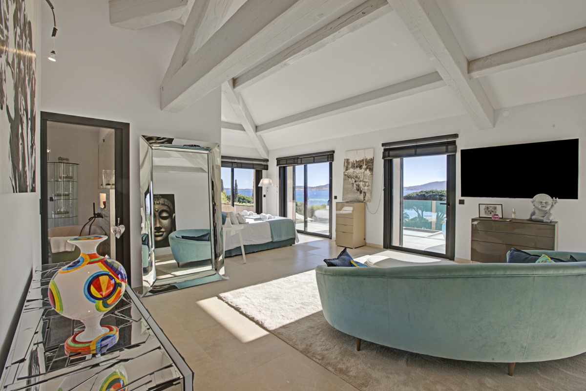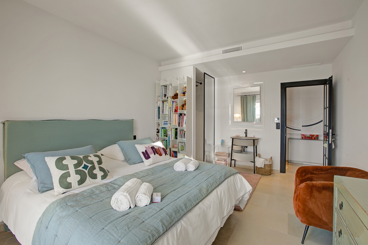 The spectacular master bedroom, on the first floor, is full of sunlight thanks to large glass doors which open onto a spacious private balcony with sea views. The bedroom covers over 100m2 and includes a seating area with a stylish sofa, a flat-screen TV. Next to this is the queen size double bed with panoramic views. There is also an en suite bathroom.