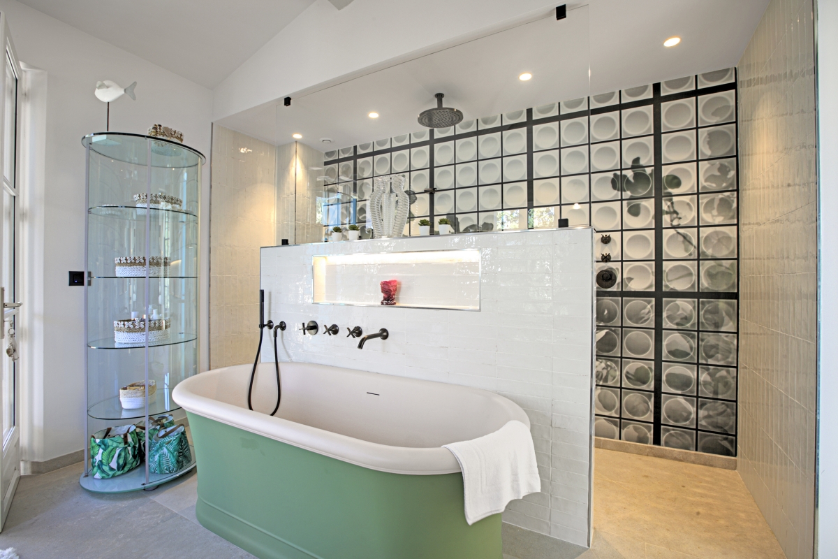 Bathroom 1: En suite to the master bedroom, this elegant bathroom even has its own balcony, and armchair with leg rest for beauty treatments. There is a full bathtub, a walk-in shower, with two basins and a separate WC.