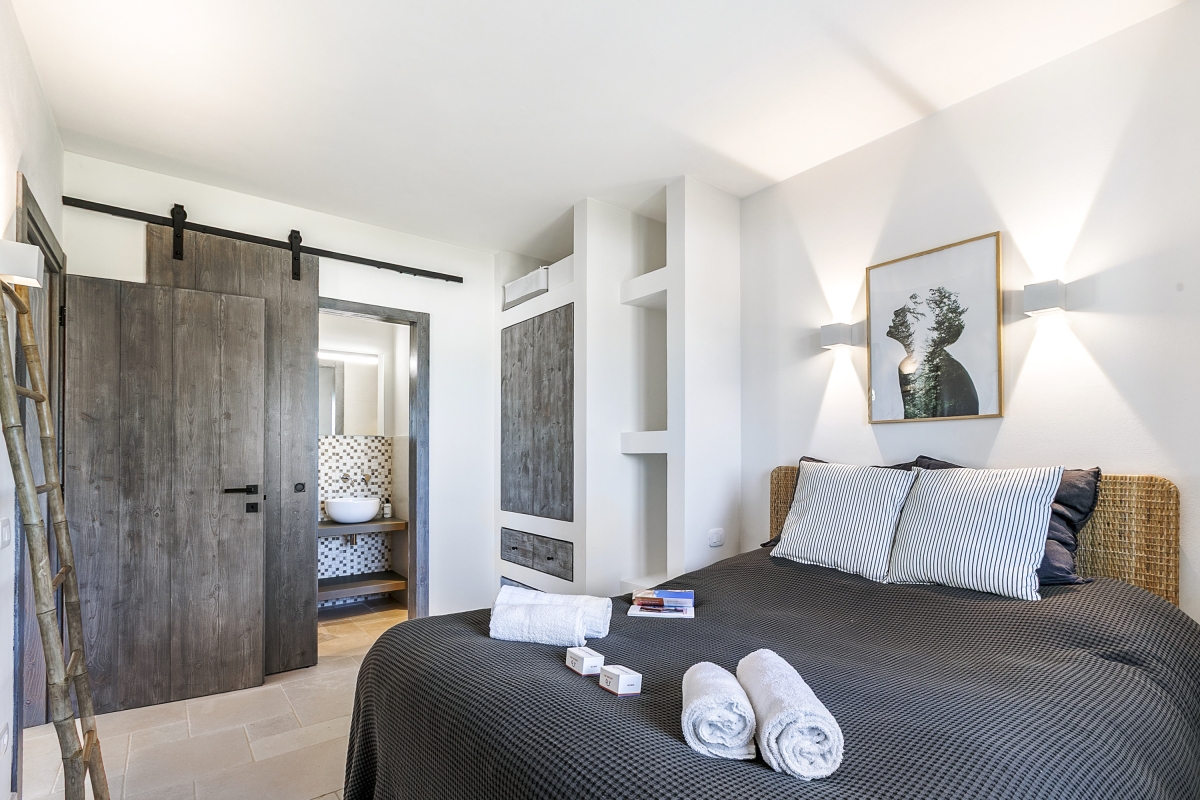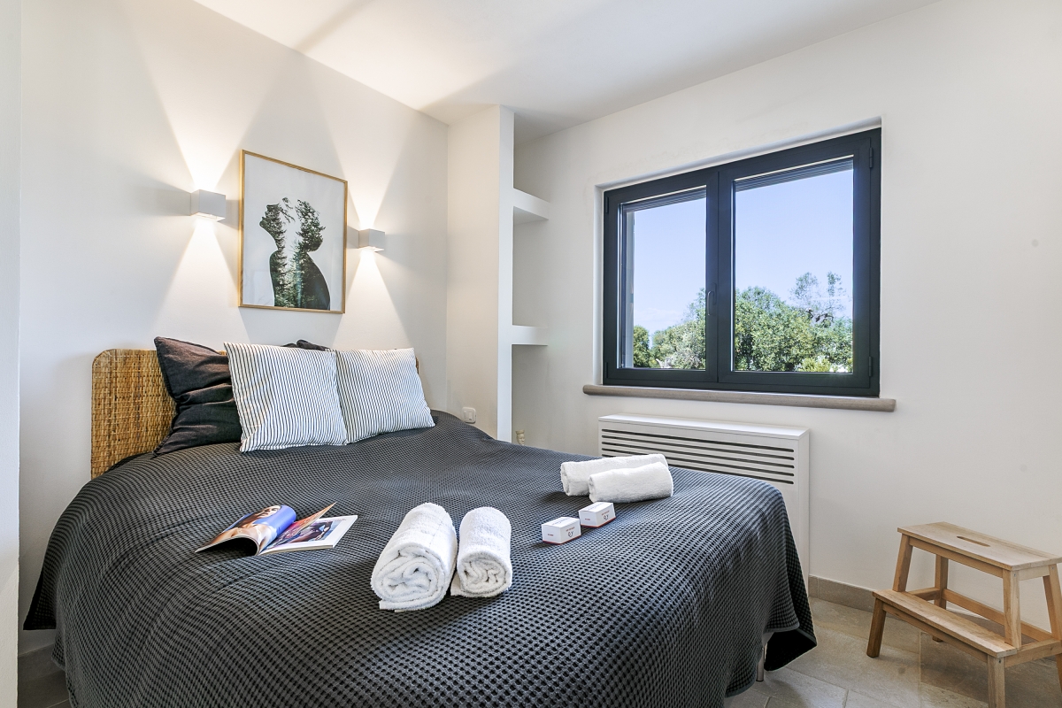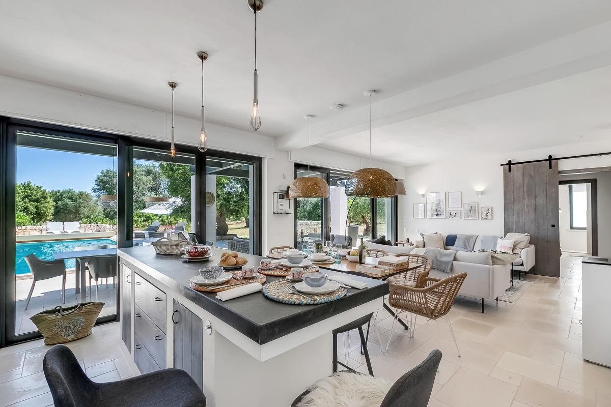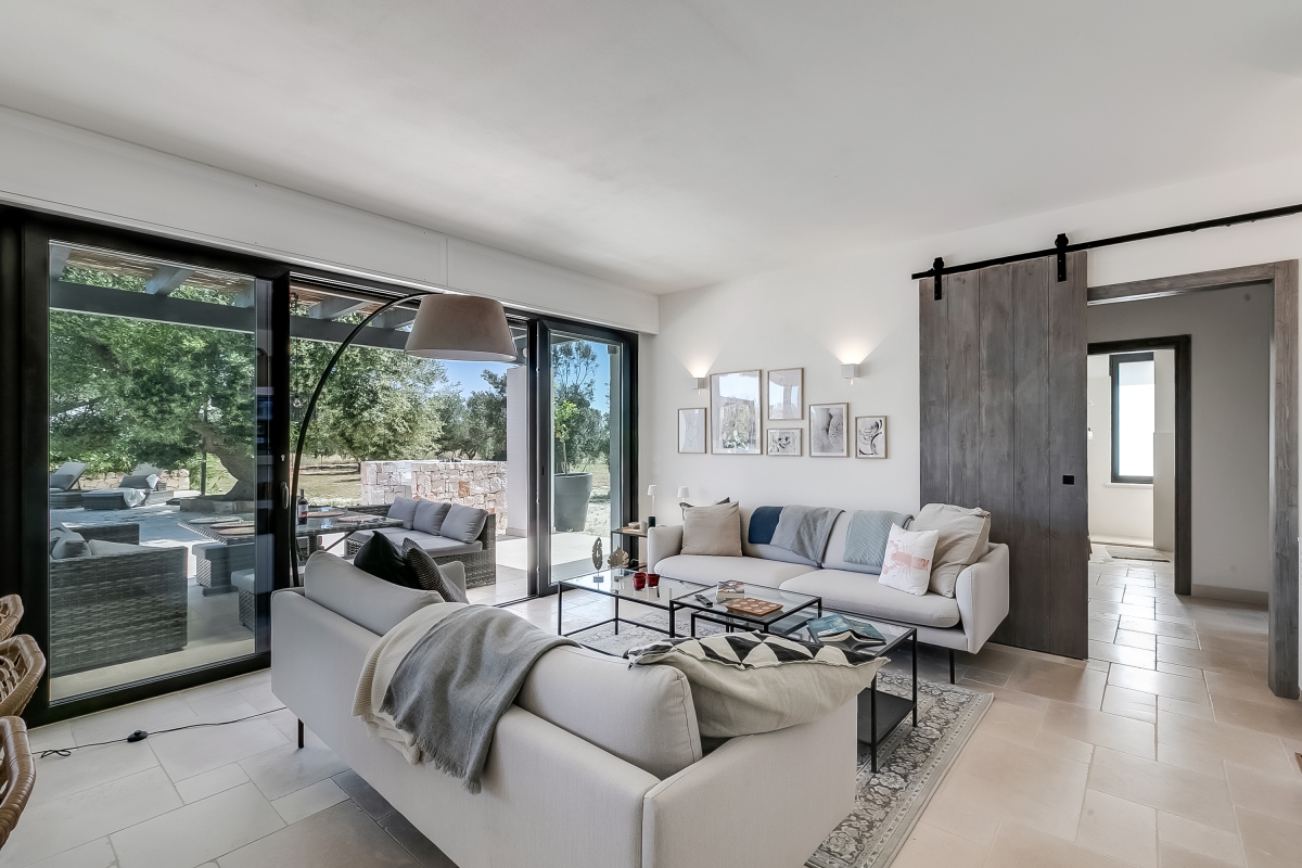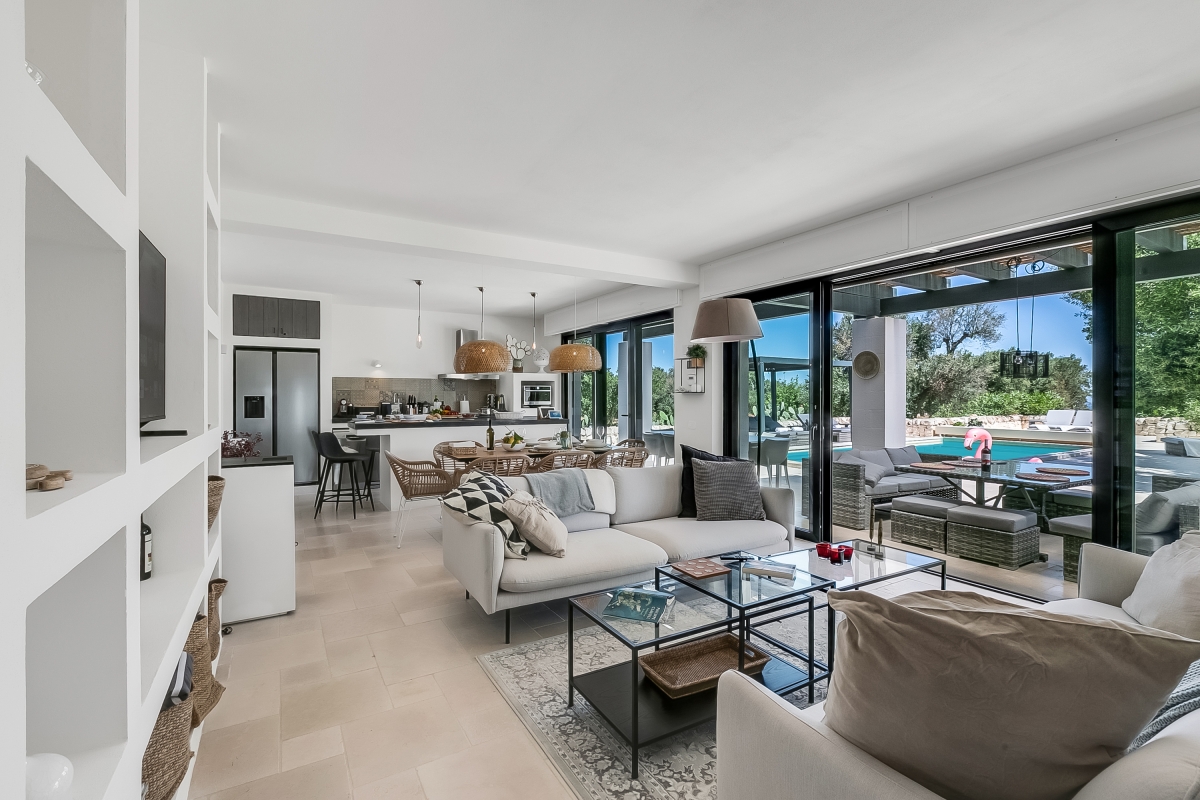 Surrounded by olive groves, this beautifully presented property is laterally arranged over a single floor and ideally set up for alfresco living with a private garden, a generously sized swimming pool and a sun terrace. There’s also an outdoor dining area, complete with a BBQ and a comfortable seating area.