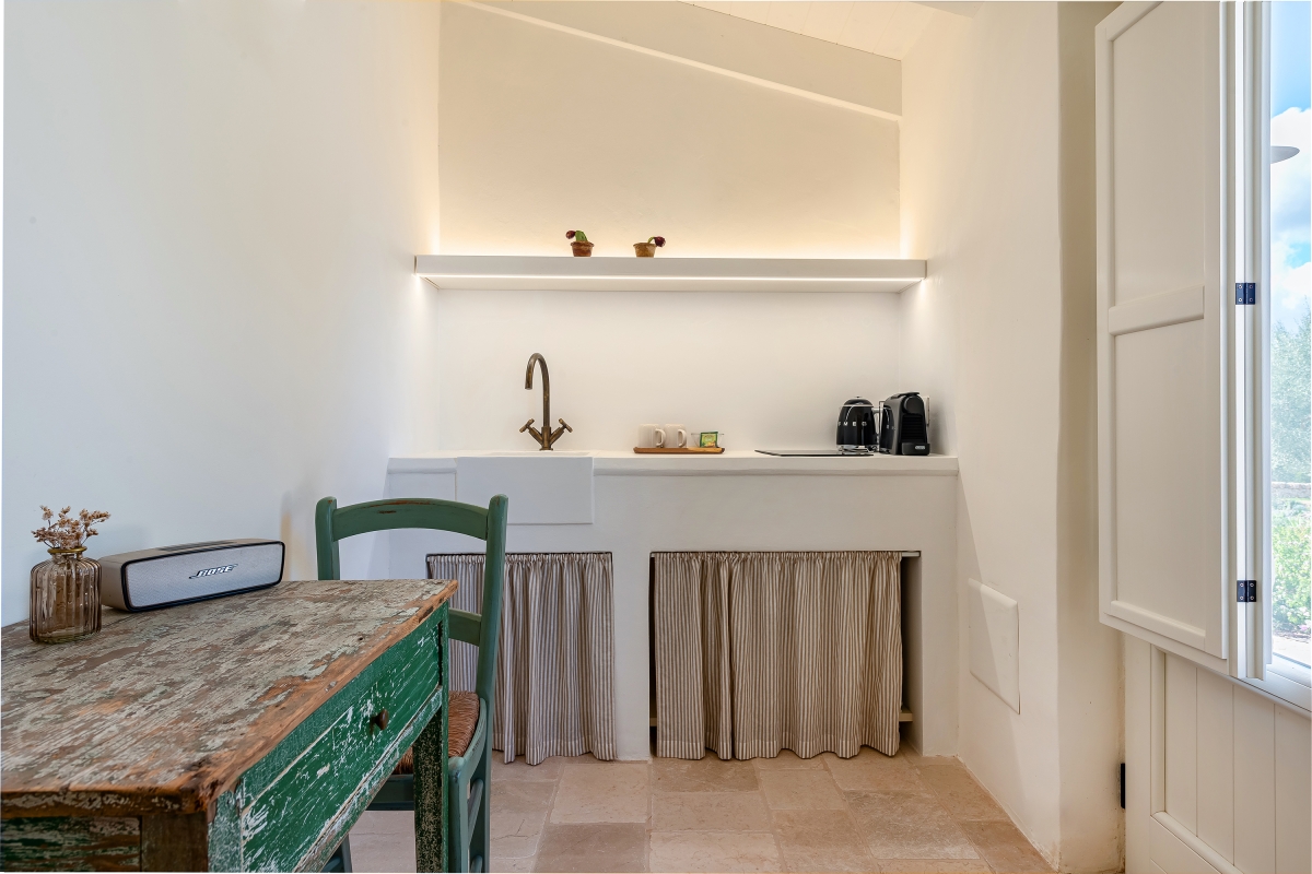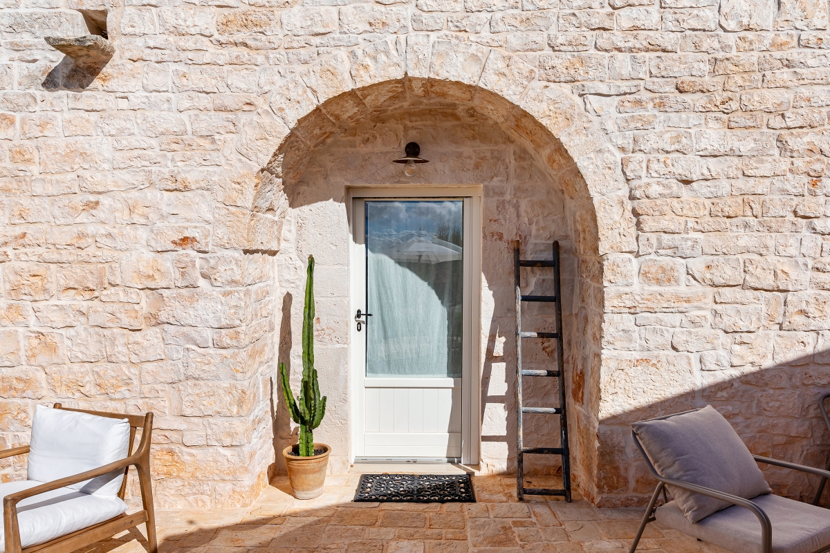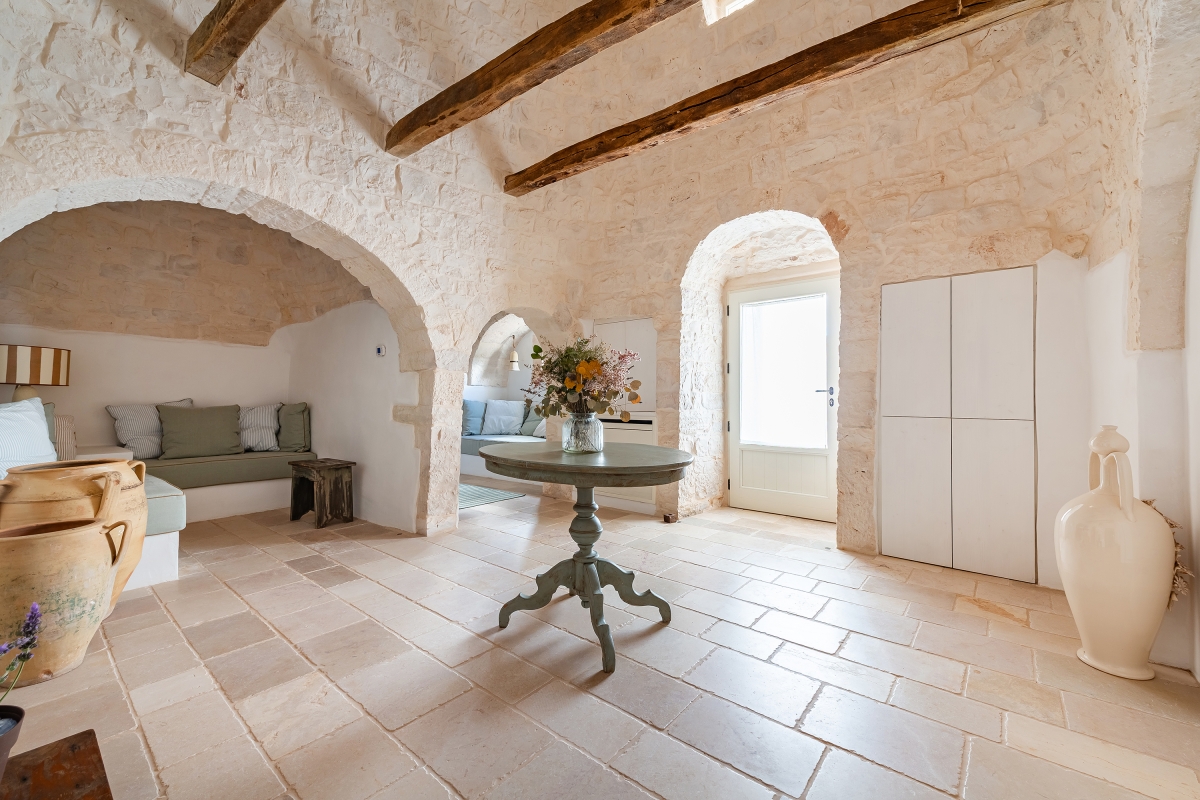 Peacefully immersed in the countryside outside Alberobello and built in the traditional Apulian style, this beautifully presented, luxury Trullo conversion features the curved lines of the original architecture, with characterful exposed stonework, whitewashed walls, and a practical tiled floor.