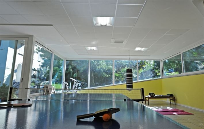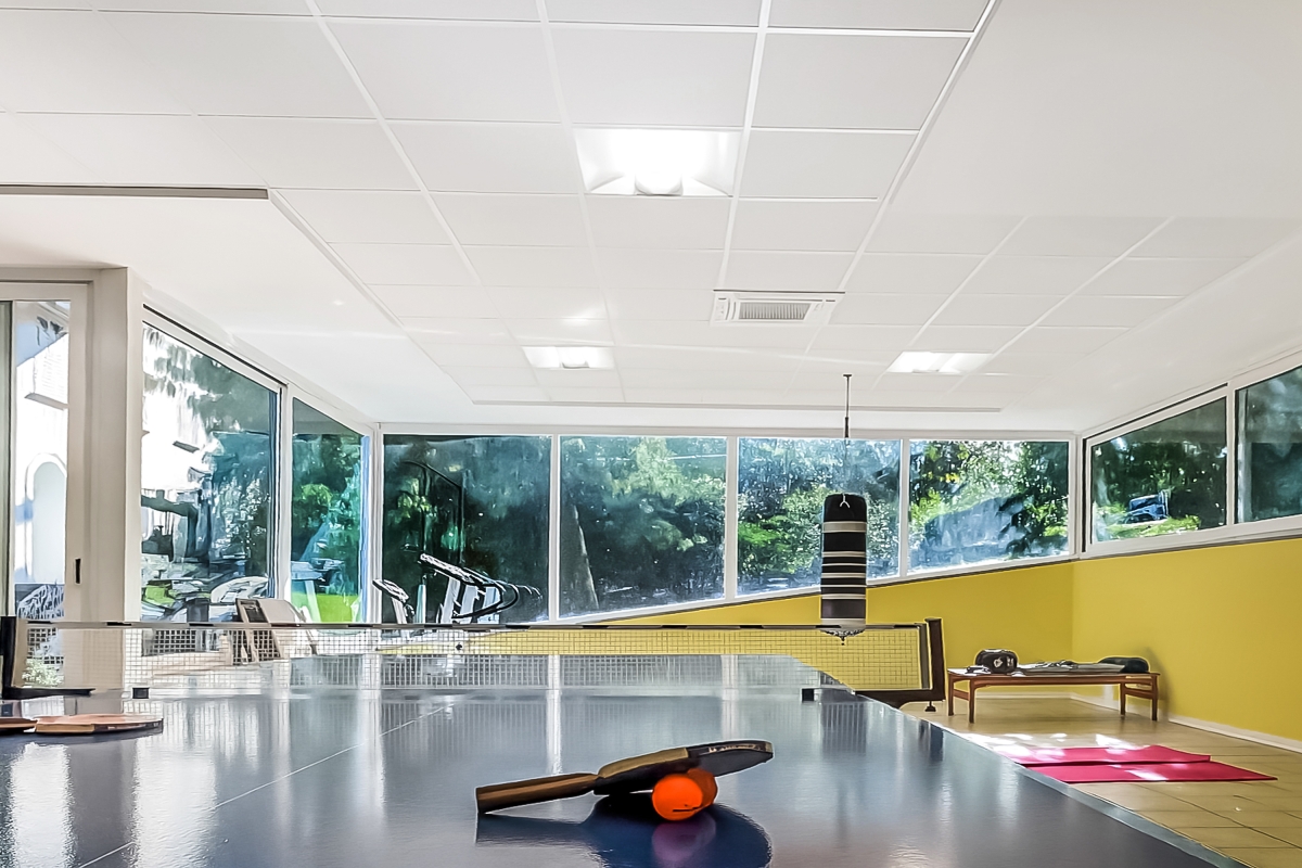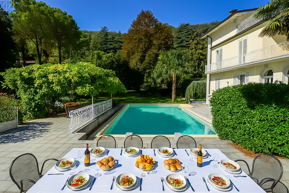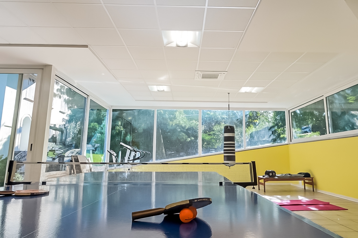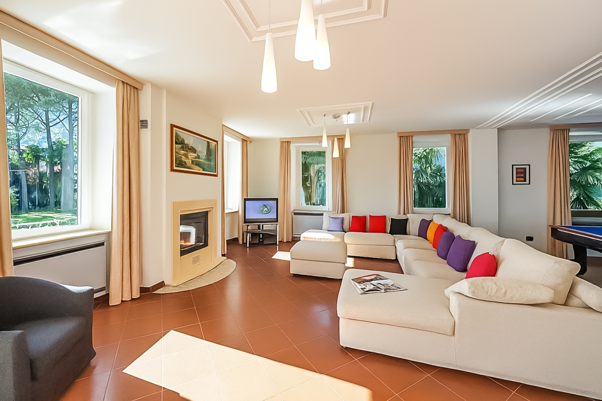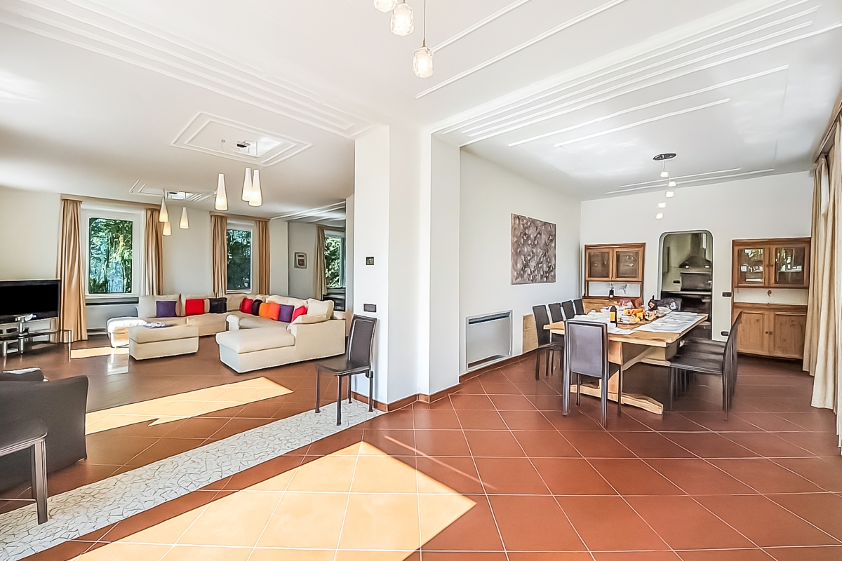 The elegant dining room seats large groups and opens out to a lake-view terrace ideal for alfresco meals or evening aperitifs. Entertainment options include satellite TVs, a Hi-Fi, gym, and a separate annex with an all-weather playroom (ping pong and Fussball).