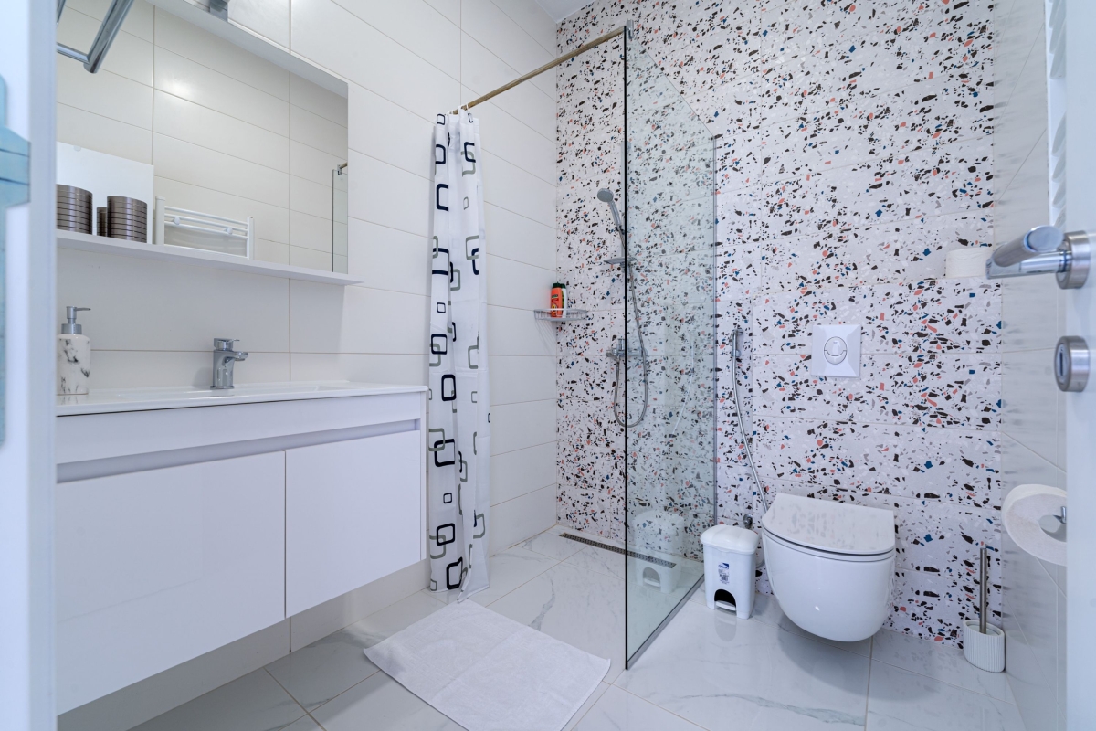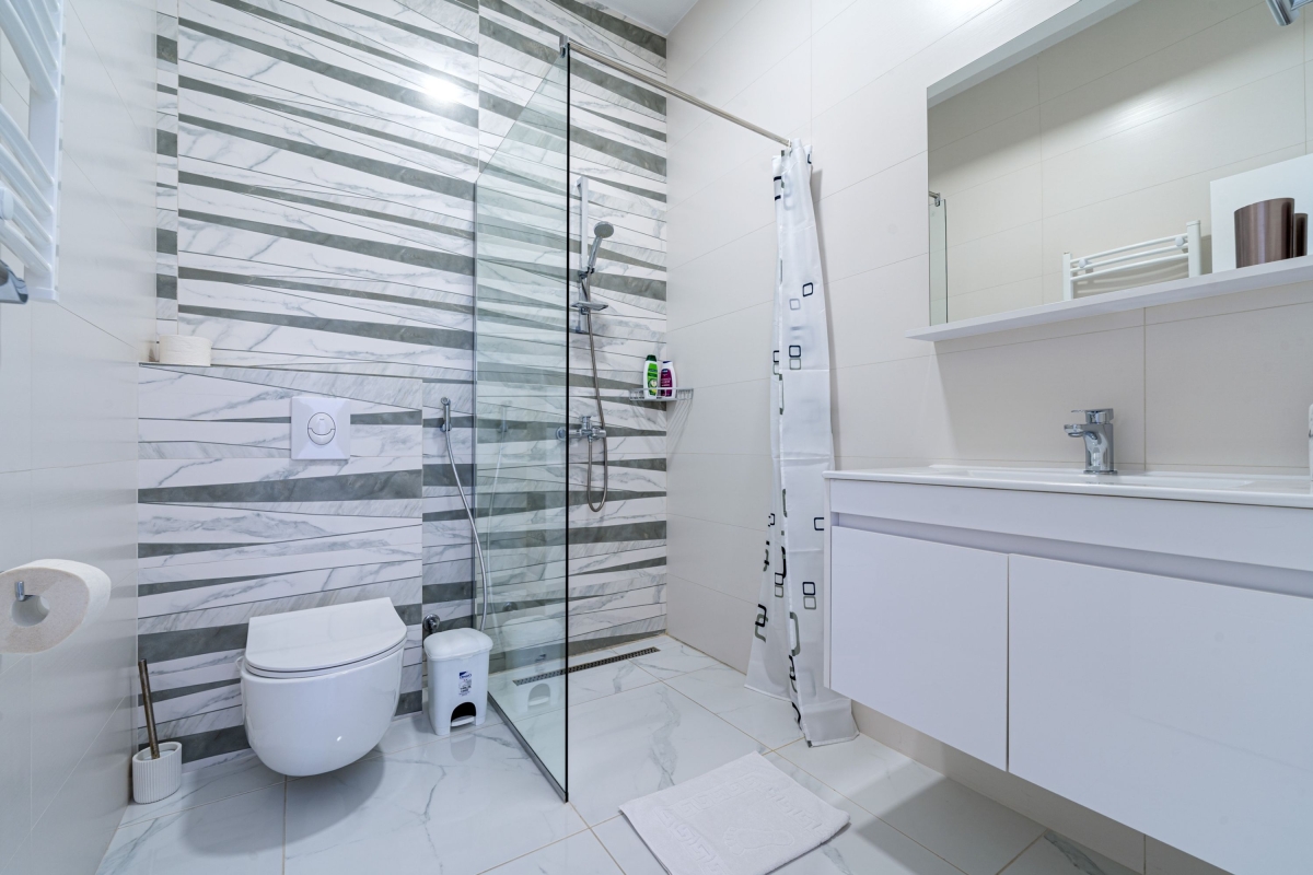 There are 4 bedrooms, each stylishly furnished with a King-size double bed, wardrobe and private balcony with a table and chairs and stunning sea views. All the bedrooms have an en suite bathroom.
