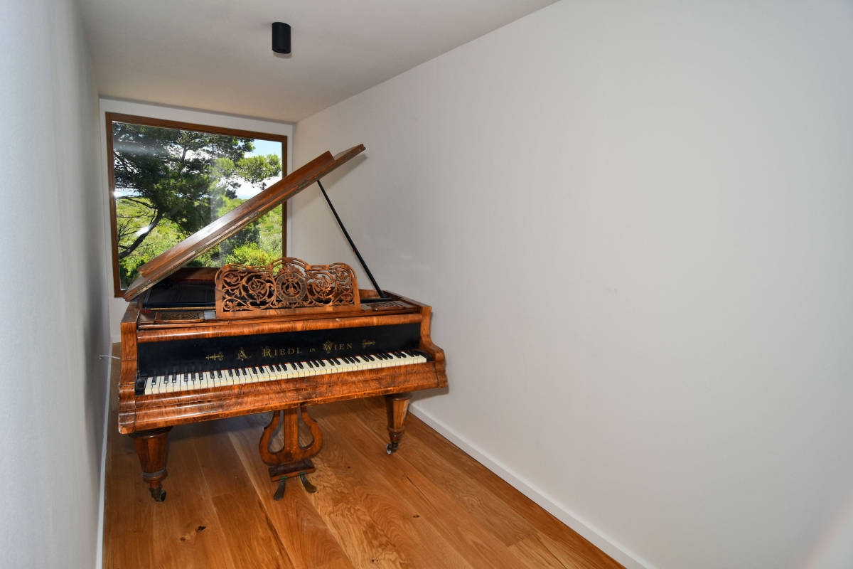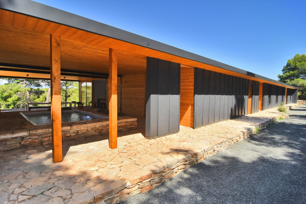 Arranged laterally with living spaces and bedrooms leading off one central corridor the property hugs the coastline and enjoys a panoramic view of the sea.