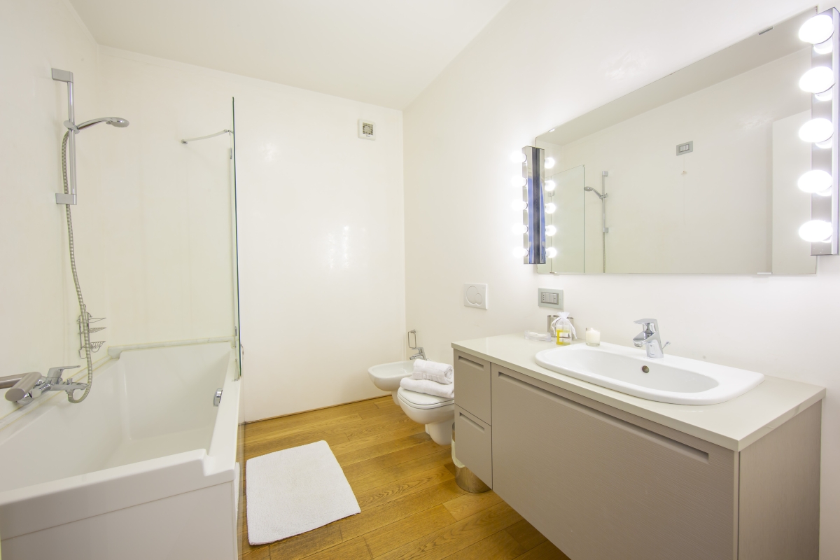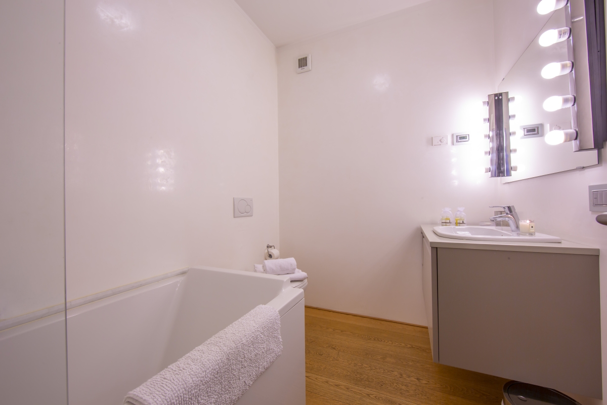 The four newly-fitted bathrooms have a range of bath and shower options as well as stylish and glamorous vanity mirrors.